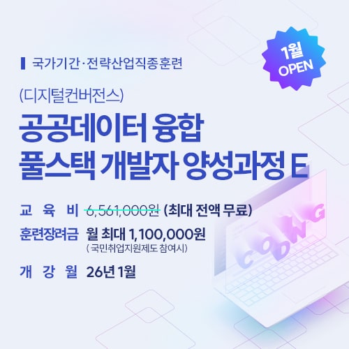 구직자에게 개인의 비용부담 없이 직업훈련을 받을 수 있는 기회를 제공하고 기업에서 필요로 하는 전문기술인력으로 양성하여 구직자의 취업과 기업의 인력채용을 지원하는 사업입니다. * 2026년 1월 과정부터 자기부담금이 발생될 수 있습니다. (최대 60만원)