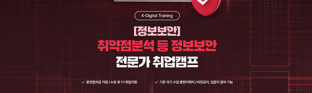 ![[정보보안] 취약점분석 등 정보보안 전문가 취업캠프 5회차 대표 이미지](https://cdn.sayun.studio/boottent/files/camps/top/header_8f2c7ff6-4142-4abe-9371-febe260edacd.png)